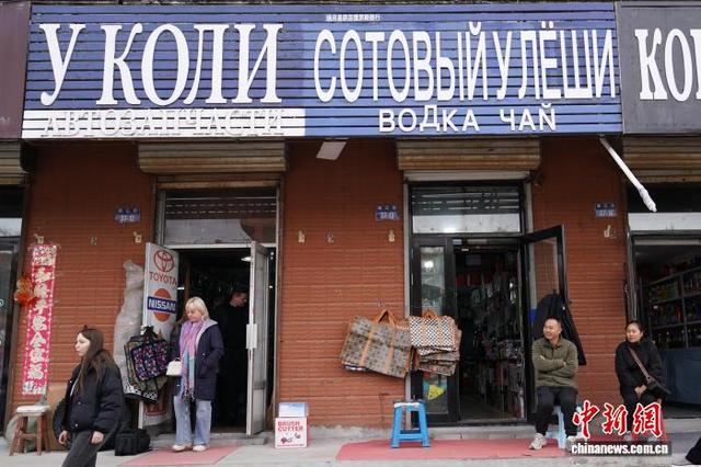 10月11日,黑龙江饶河,俄罗斯游客在带有俄文的商店选购物品。中新社记者 赵宇航 摄
