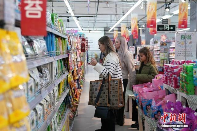 10月11日,黑龙江饶河,俄罗斯游客在超市选购物品。中新社记者 赵宇航 摄