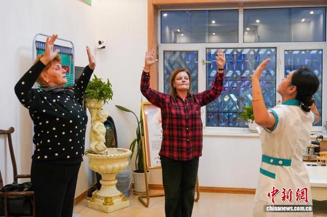 10月11日,黑龙江饶河,俄罗斯游客在中式康养馆体验中式健身操。中新社记者 赵宇航 摄