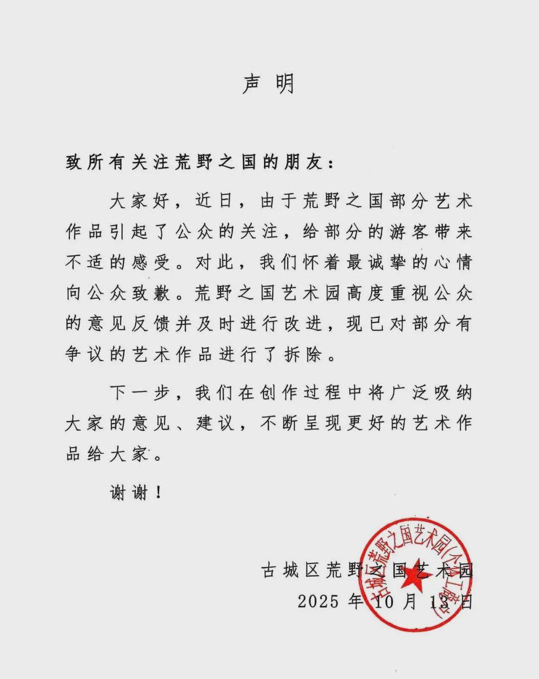 “荒野之国”艺术园发布声明致歉称,“部分艺术作品引起关注,给游客带来不适感受。艺术园高度重视意见反馈,已对部分有争议作品进行拆除。”