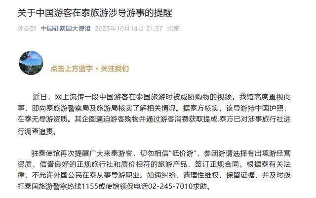 10月14日晚,中国驻泰国大使馆发布《关于中国游客在泰旅游涉导游事的提醒》,全文如下: