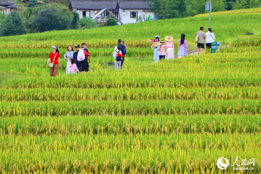 崇义县上堡乡水南村,层叠蜿蜒的梯田吸引不少游客前来游览。人民网 朱海鹏摄