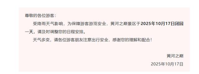 受降雨天气影响,为保障游客游览安全,黄河之巅景区于2025年10月17日闭园一天,请及时调整您的日程安排。