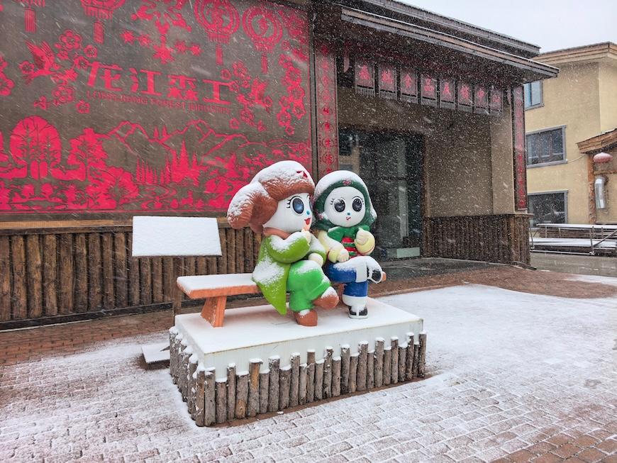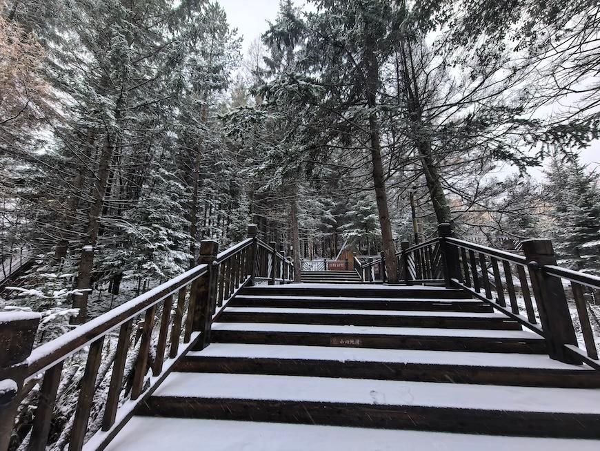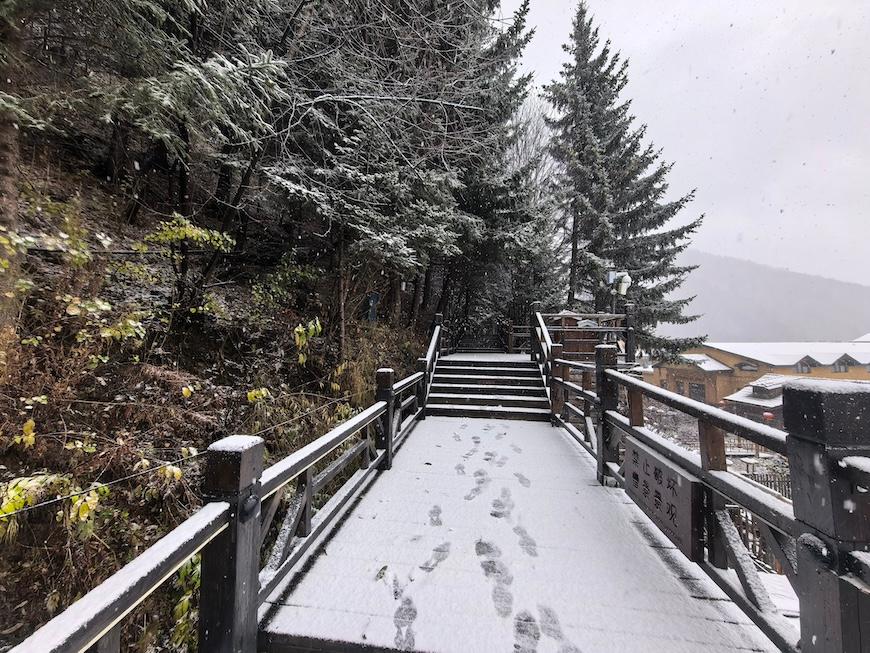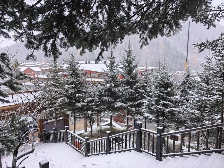 纷纷扬扬的雪花漫天飞舞,降落在房顶、栈道、树枝,随物赋形,新雪压枝、绿草覆白,雪花和深秋美景遥相辉映,整个雪乡银装素裹,尽展雪景魅力。