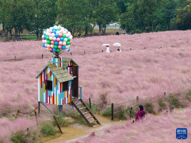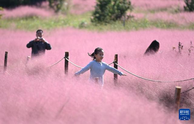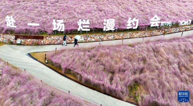 10月19日,在山东省临沂市沂南县卧龙山公园,游客在粉黛乱子草中打卡拍照(无人机照片)。