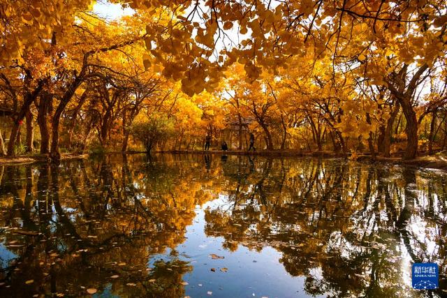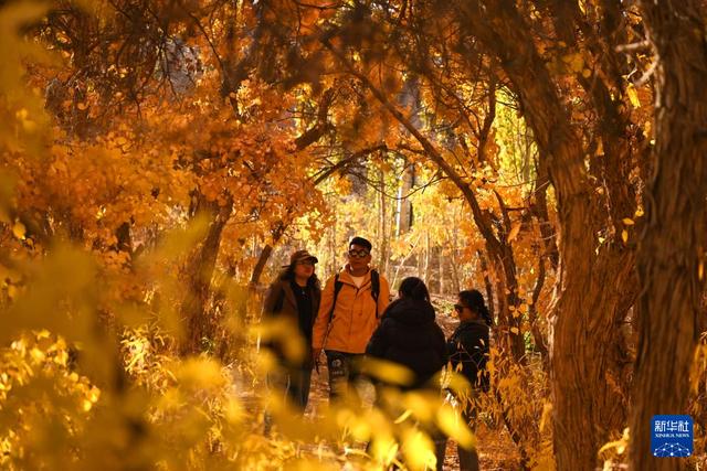 10月19日,游客在甘肃省敦煌市莫高镇的胡杨林中游览。