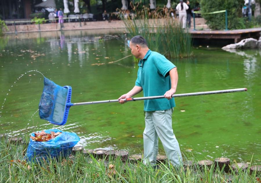 落叶知秋 | 秋风秋雨打落了片片秋叶。静安公园里,工作人员一点点捞起池塘里的落叶,甩起的水珠划出了美丽的弧线。 新民晚报记者 周馨 摄