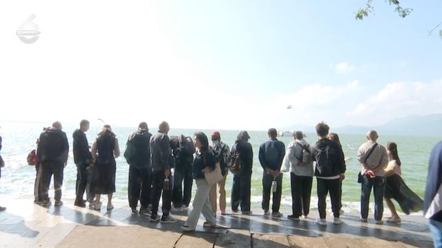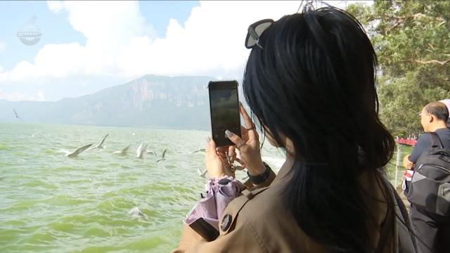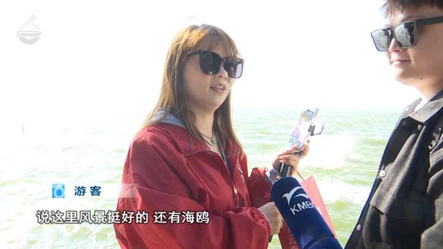 游客:“我们从江苏来的,我们就是为了海鸥来打卡的。因为云南昆明这边的环境很好,江苏那边距离天空很远,感觉这里距离天空很近,而且这里的天空很蓝,白云很白,空气很新鲜的感觉,超级浪漫。”