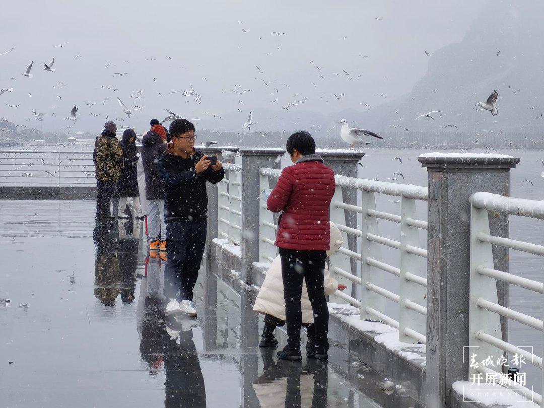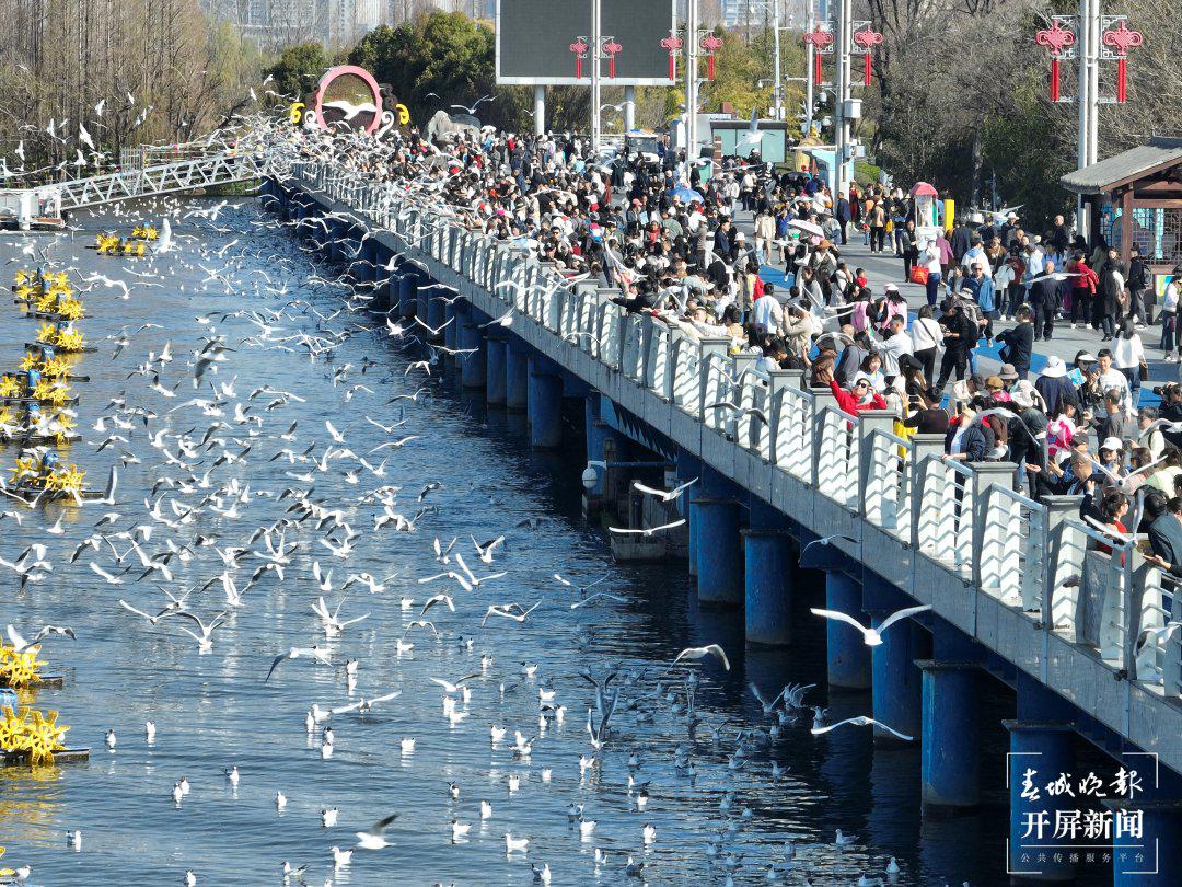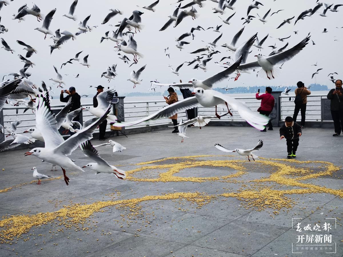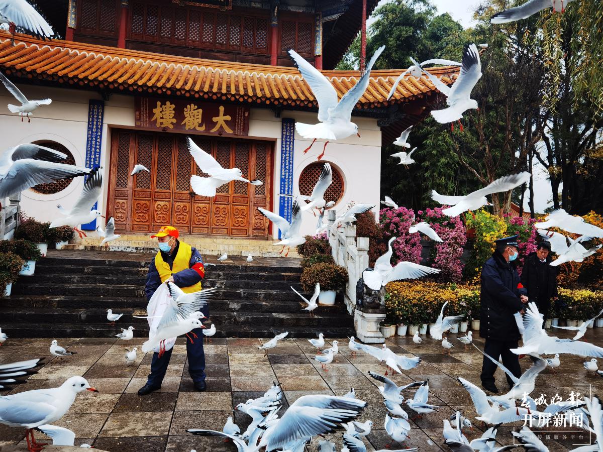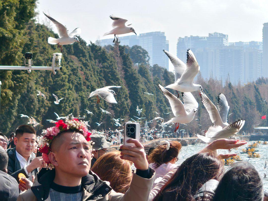 既可以欣赏宽阔湖面碧波荡漾,也可以观赏或停歇于假山、亭台楼阁之上,或成群结队在空中翱翔的红嘴鸥,感受春城的无限生机。