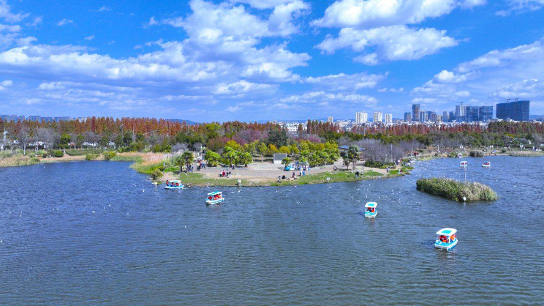 自然植被丰茂、种类繁多,还设立了观鸟长廊,能看见很多红嘴鸥掠过水面。芦苇荡、飞鸟、湿地与远处的西山、滇池,共同构成一幅自然恬静的生态画卷。