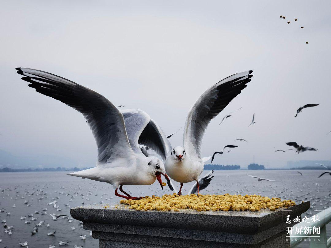 红嘴鸥是杂食性鸟类,以小鱼小虾之类的肉食为主。昆明根据红嘴鸥的饮食制作鸥粮,兼顾营养、经济、红嘴鸥食性。