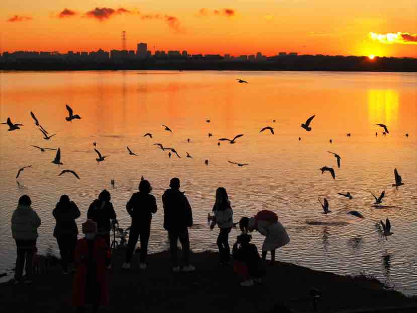 紧邻大观河,河水清澈,景色宜人,离大观公园不远,可以近距离观赏大片红嘴鸥从水面起飞的场景。