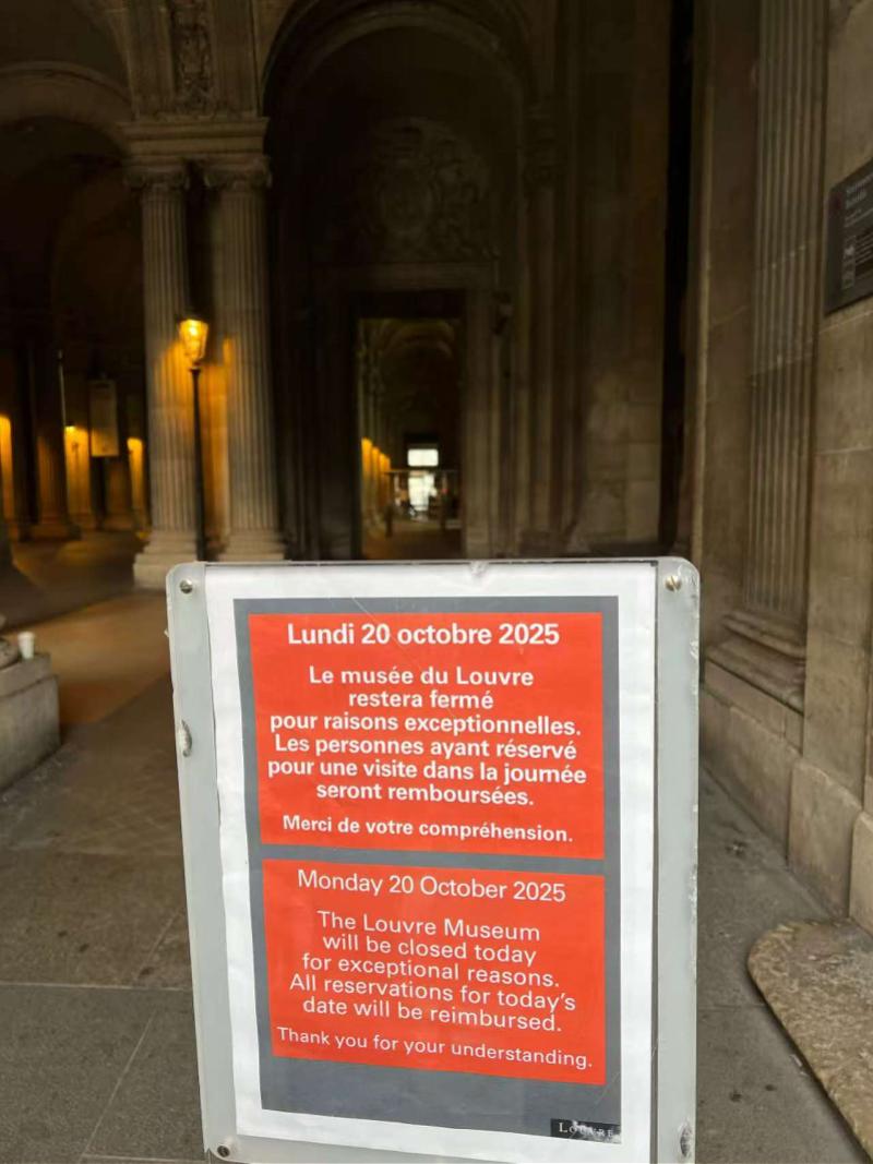 当地时间10月20日,卢浮宫发布公告称,在19日发生抢劫事件后,博物馆当天将继续对公众关闭,已购票的游客将获得退款。