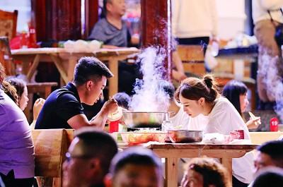 游客在贵州镇远县古城河边夜市品尝美食。新华社发