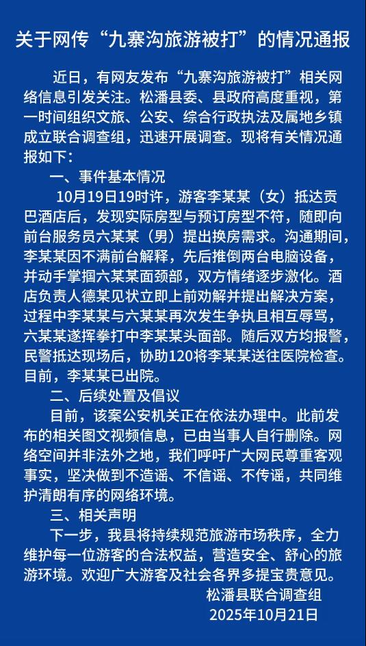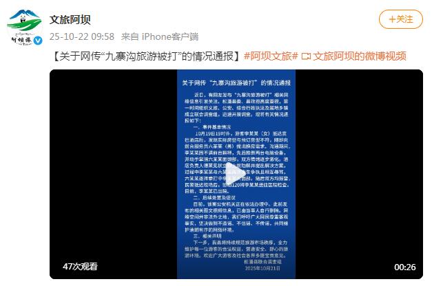 10月22日,@文旅阿坝 发布关于网传“九寨沟旅游被打”的情况通报:
