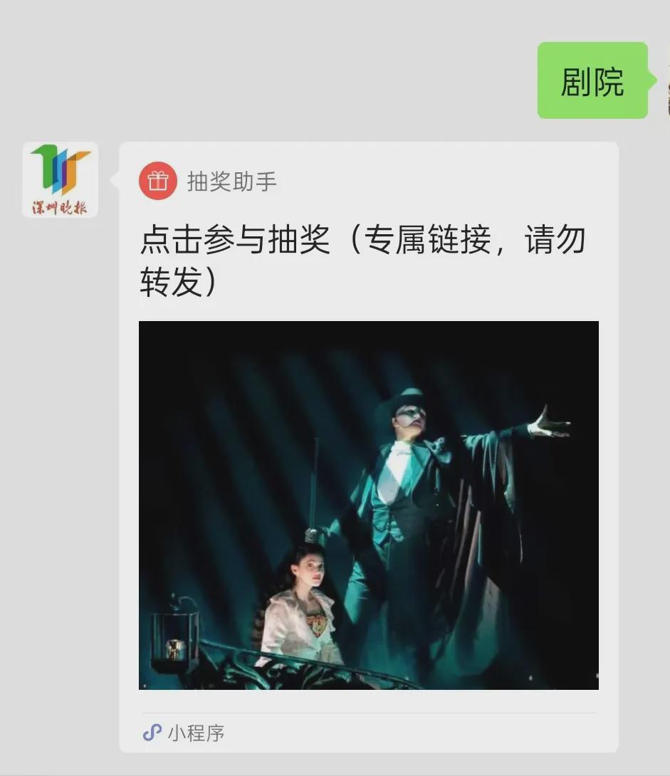 3、在对话框中输入关键词“剧院”,获取链接参与抽奖