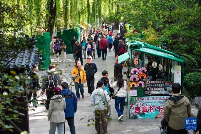 10月22日,人们在山东济南泉水绿道步行观看泉水景观。