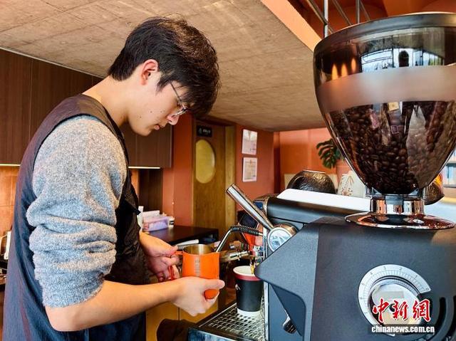10月22日,在浙江省宁波市奉化区,溪口镇东山村的一家咖啡店吸引不少游客打卡。这座开在半山腰近400米海拔处的咖啡店距离市区一个小时车程,能将宁波溪口雪窦山风景名胜区的风光尽收眼底,成为“网红”地,自去年开业以来已经吸引十多万人次打卡,为乡村经济发展注入新流量。图为店员制作咖啡。中新社记者 张斌 摄