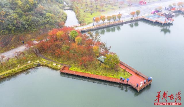 (阳明山国家森林公园万和湖畔,枫叶似火,湖水轻柔,廊亭栈道,颇具诗情画意。辜鹏博 摄)