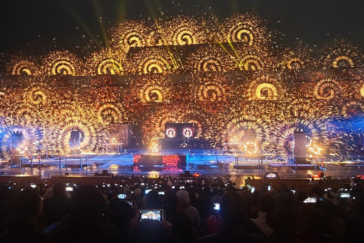 铁水泼向夜空,如星雨倾泻,万点金光绽作“铁树银花”,引得观众席惊叹连连“不虚此行!”“独属于中国人的浪漫!”“真是视觉盛宴!”表演结束,游客仍流连忘返。