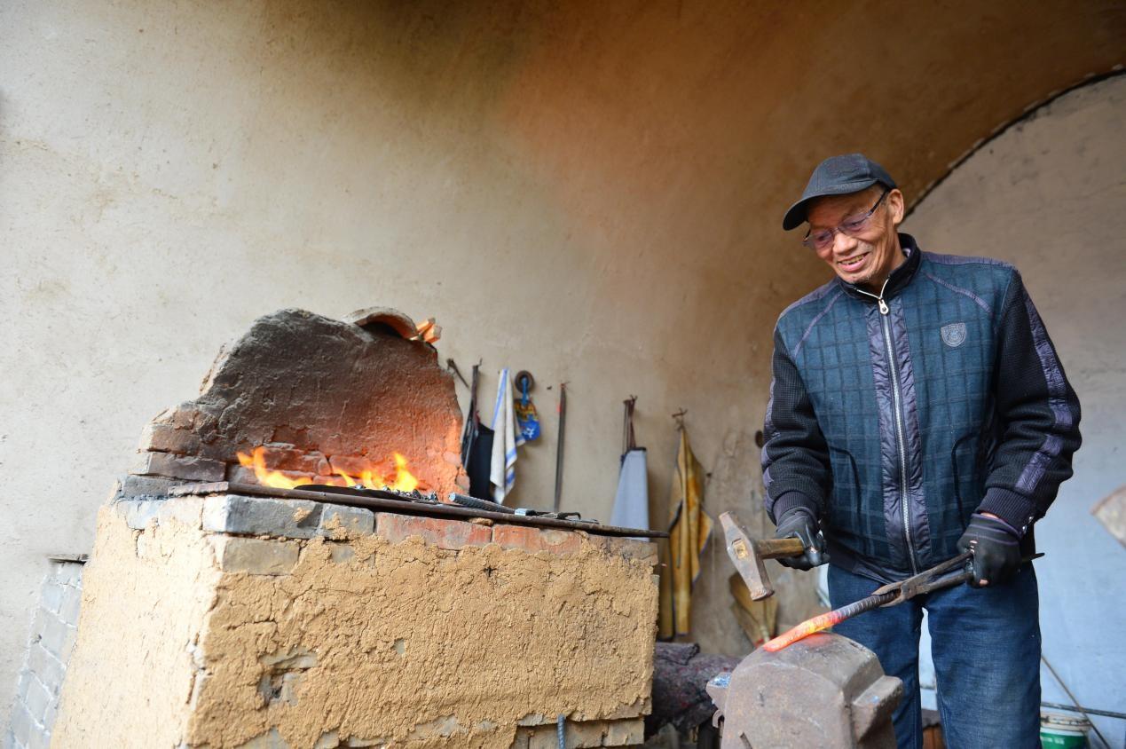 晋城市泽州县大阳古镇,当地自古冶铁业发达,村民向游客展示传统冶铁技术。陈斌摄