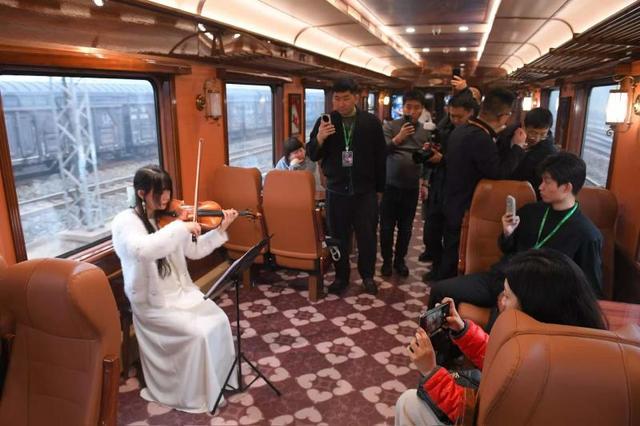 登上“津旅时光号”前往蓟州北站,不少旅客发出“我穿越了!”的惊叹。列车打造的10个主题车厢最为亮眼。传统的列车座椅被拆分重组,每节车厢形成互动区或演艺区,并配备移动舞台、隐藏灯轨和环绕音响,为旅客提供全方位的互动体验。