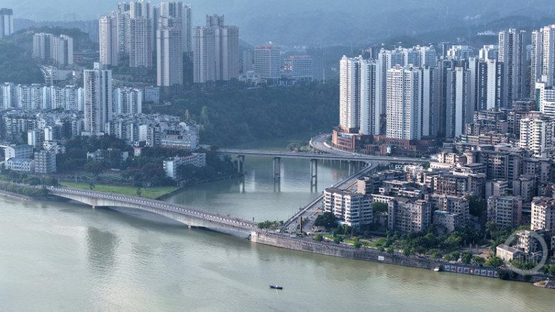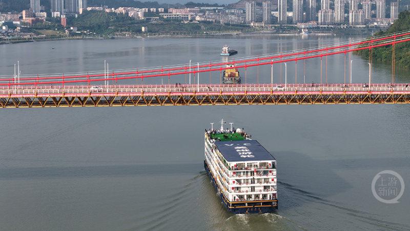 在长江忠县县城段,随着水量的大幅增加,水位抬升,水面变宽,一江碧水浩渺无垠,与航船、桥梁、城市街景共同构成一幅秀美的江城画卷。