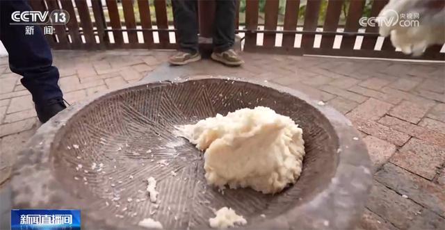 蒸熟的糯米这样反复捶打,就能打出香甜的糍粑,再裹上黄豆粉,自己的成果就可以品尝了。