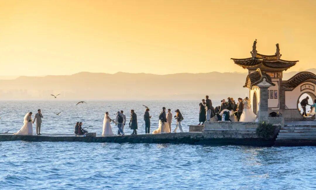 新人在洱海边拍摄婚纱照。赵渝 摄