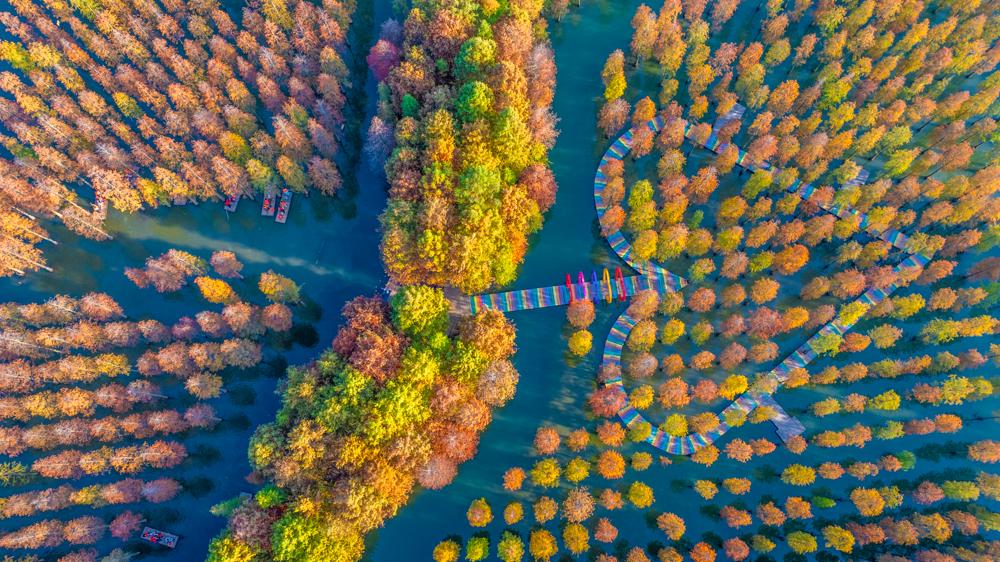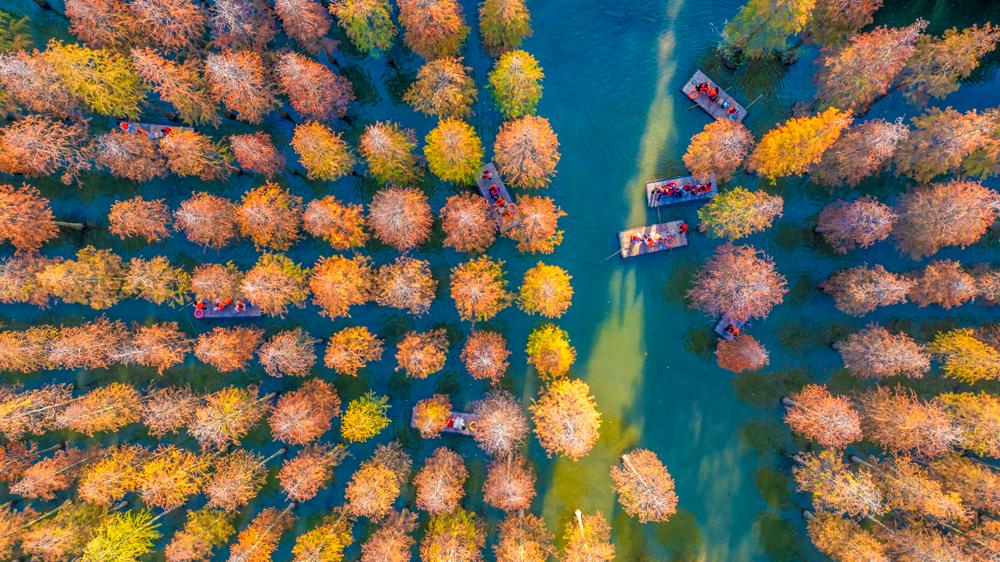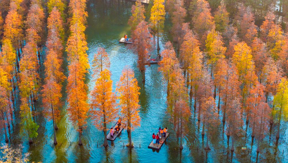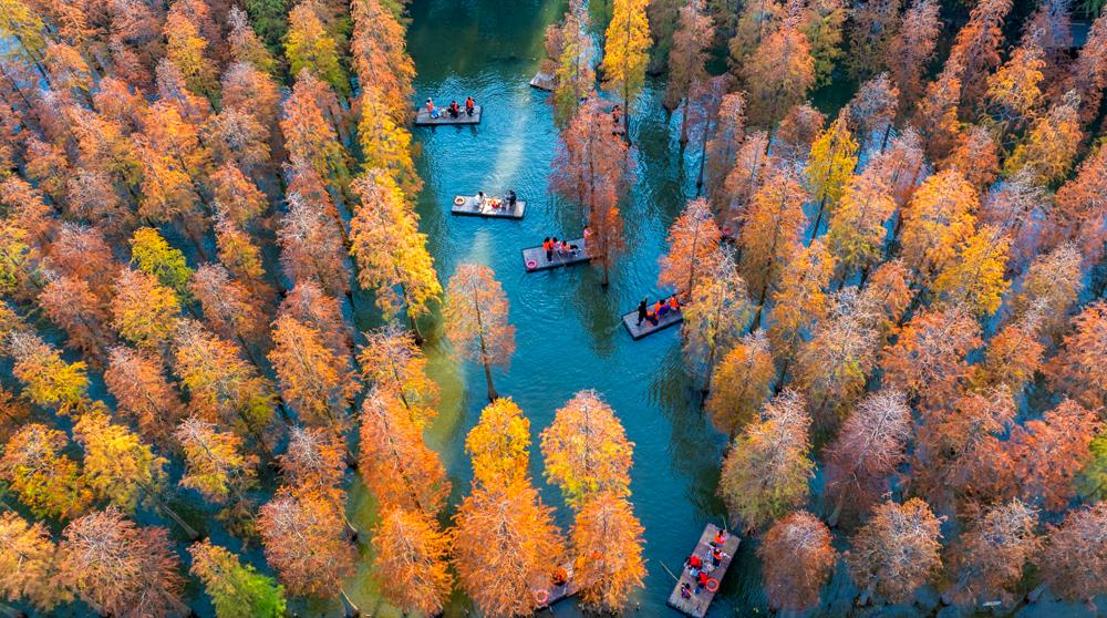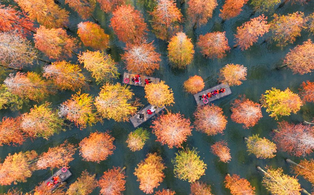 2025年11月2日,江苏省宿迁市泗洪县洪泽湖湿地景区水杉林色彩斑斓,游客乘坐竹筏畅游林间,构成一幅美丽的秋日画卷。