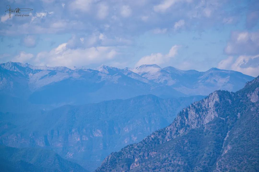 期间正好碰到一位当地人带着朋友过来赏景,于是我便凑个机会上前发问,从而得知原来这里只能看到玉龙雪山的背面(最远处的山脉),又因为这一带的群山的地域划分比较复杂,所以他只知道前面右手边的最高峰名为“药山”(或耀山)。好在我有长焦镜头,所以才能在此分享玉龙雪山的背影,呵呵。