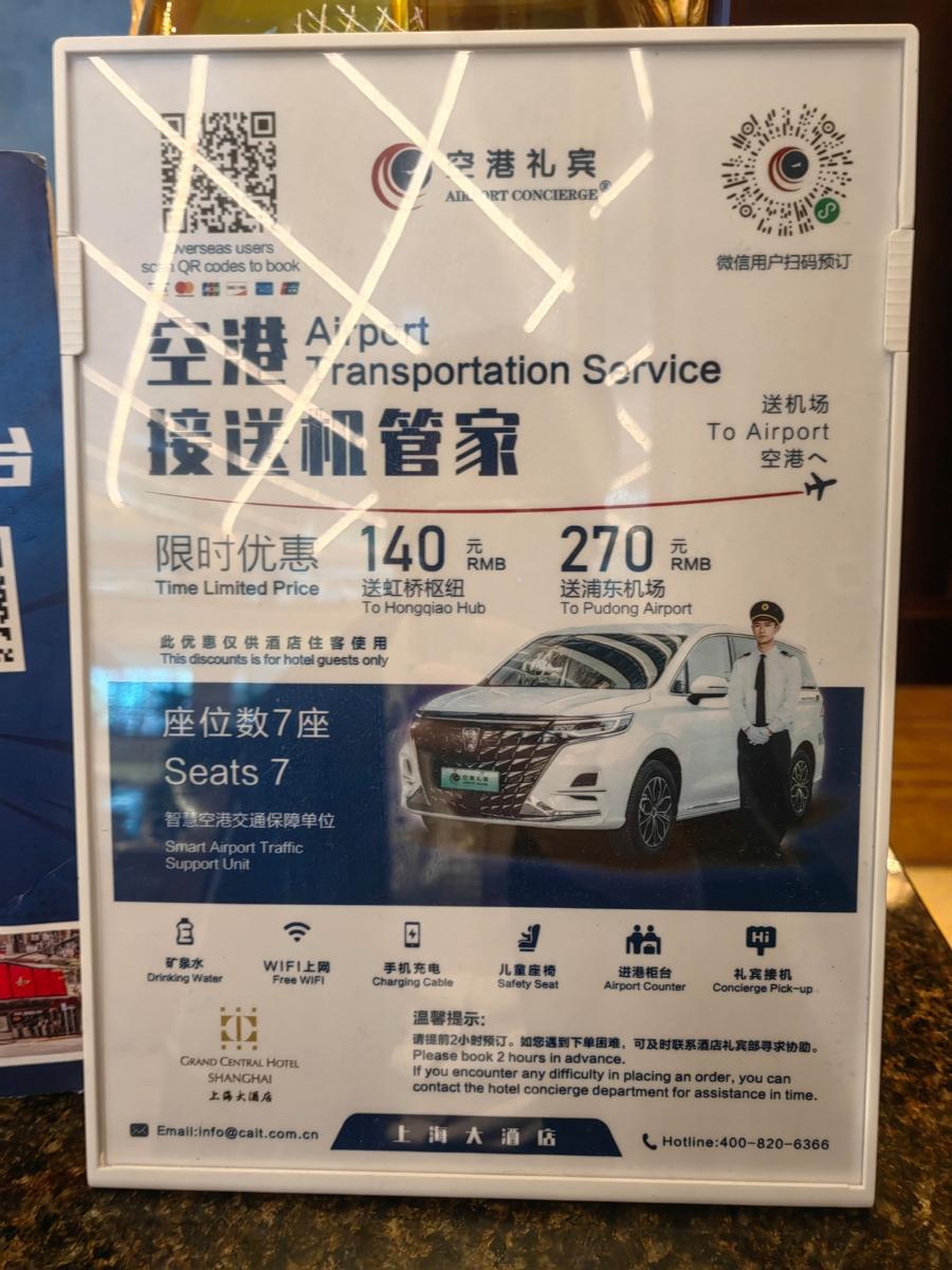 比如,早期韩国年轻人多选择地铁、巴士出行,但如今韩国客人拖家带口、行李又多,选择公共交通就不太方便。考虑到常见的出租车无法乘坐五六个人,酒店就与空港礼宾公司合作,向住客提供7座商务车预约服务,每间客房摆放预约二维码,从酒店到虹桥枢纽140元,到浦东机场270元,与市场价齐平。