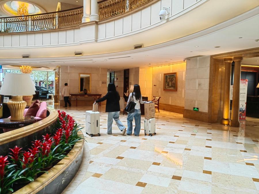 记者走到上海大酒店门口,看见韩国父母抱着婴儿边等车边聊天。走入暖色调的酒店大堂,年轻的韩国情侣、五六人的韩国一家三代,或是背着书包,或是拖着行李推着婴儿车进进出出……