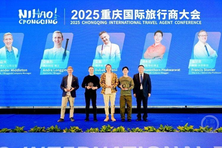 在帮助重庆全球圈粉方面,来自世界各地的国际友人功不可没。本届大会中也有5位致力于重庆文旅推广的国际友人获颁“2026年度重庆文化和旅游推广大使”,他们分别是英国视频博主亚历山大、澳大利亚视频博主安德烈、俄罗斯视频博主艾斯、泰国专栏博主林永珪、西南大学美籍教授福兰克。