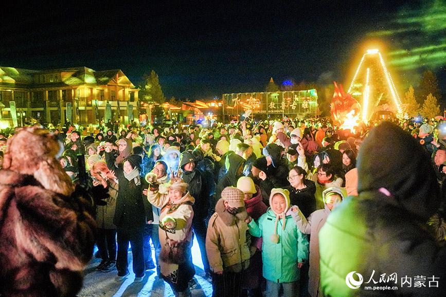 11月6日,呼伦贝尔市根河市的敖鲁古雅广场的篝火活动吸引众多游客。根河市文化旅游广电局供图