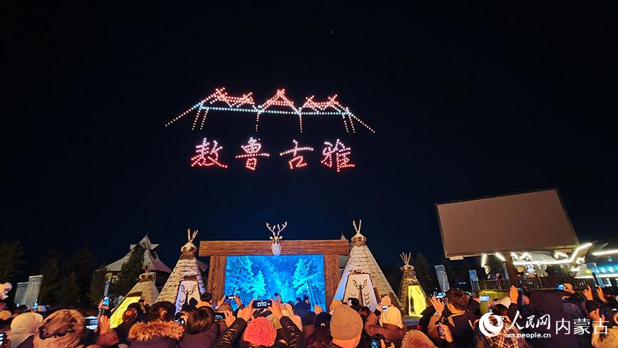 11月6日,呼伦贝尔市根河市的敖鲁古雅广场,数百架无人机编队升空,精准组成“中国冷极 驯鹿之乡”巨幅动态图案。人民网记者 富丽娟摄
