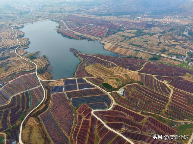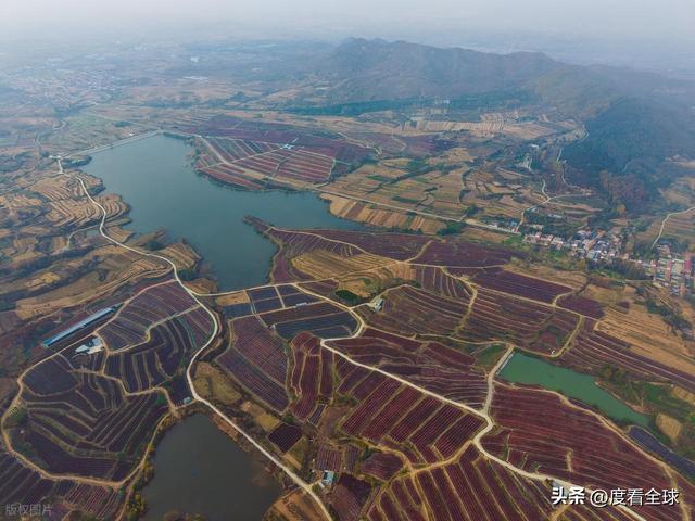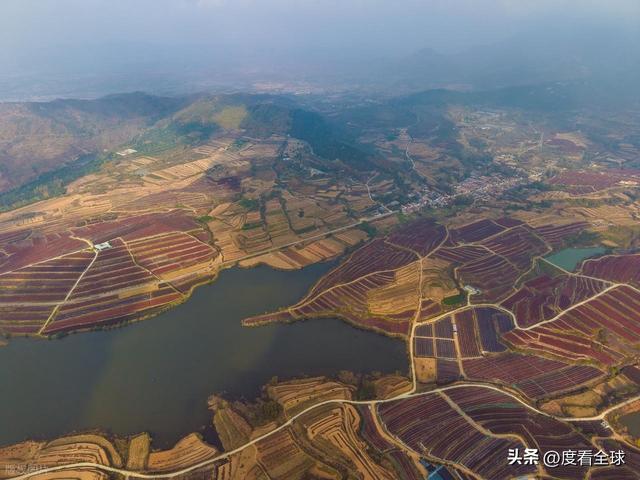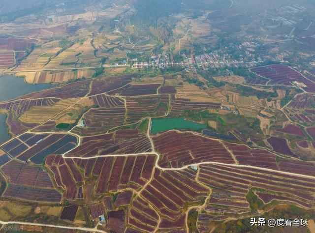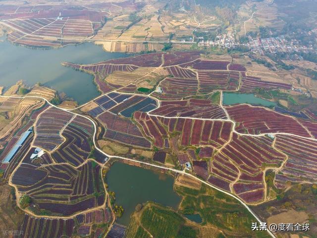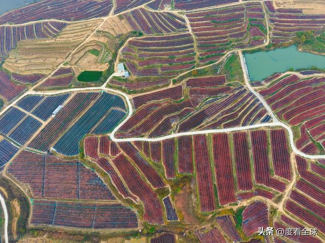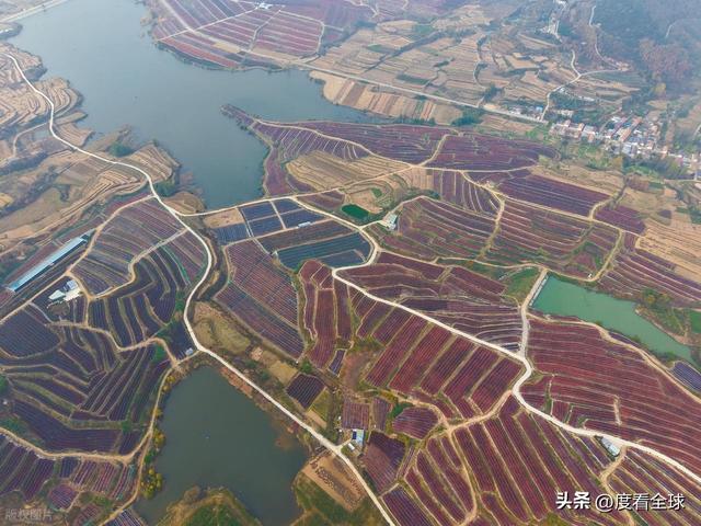 蓝莓树的行距整齐划一,一排排、一列列,形成规整的几何图案,在红叶的映衬下,宛如大地精心编织的红色锦缎。远处的南湖水库波光粼粼,湛蓝的湖水与红色的林海相互映照,水天一色、红蓝交织,构成一幅绝美的山水画卷;更远处的群山层峦叠嶂,墨绿的松柏与红色的蓝莓园遥相呼应,山、水、林、田融为一体,分不清是自然的鬼斧神工,还是人工的精心雕琢。