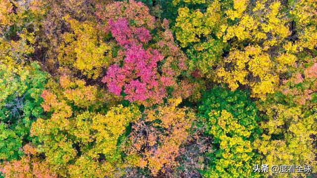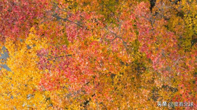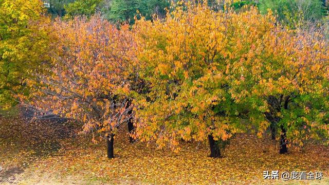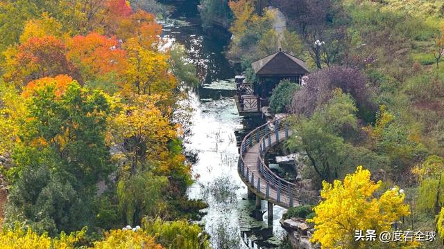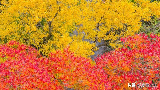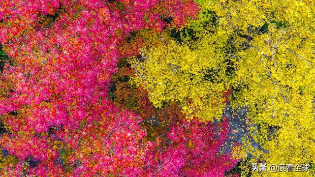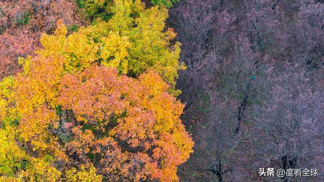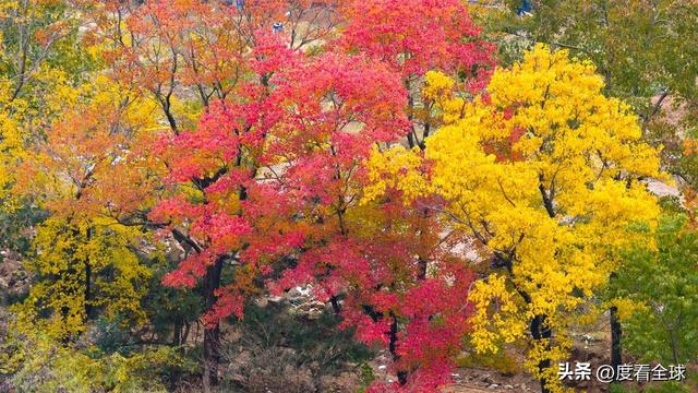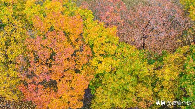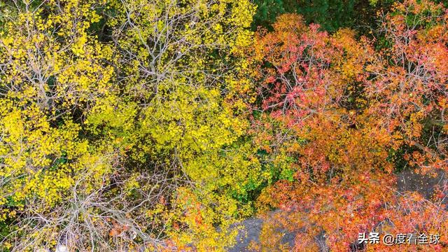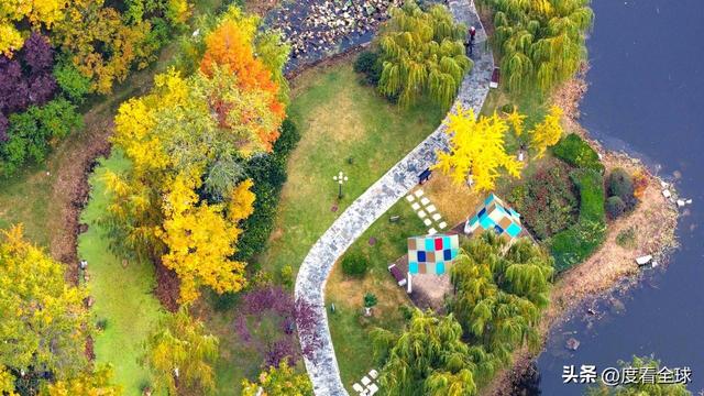 河畔的林木种类繁多,每一种树木都在初冬绽放出独特的色彩。美国红枫的叶片是热烈的火红,像是燃烧的火焰,在阳光下显得格外耀眼;鸡爪槭的红则多了几分含蓄,是那种深深浅浅的绛红,带着水墨画般的韵味;银杏和白蜡树则贡献了最灿烂的金黄,成片的银杏林在阳光下如金色的海洋,风吹过便掀起层层金浪;而油松和侧柏则坚守着最后的苍翠,为这幅彩色画卷添上了沉稳的底色。这些色彩交织在一起,形成了深深浅浅、明明暗暗的层次感,远远望去,就像一幅铺展开的巨型油画,每一笔都充满了自然的灵气。