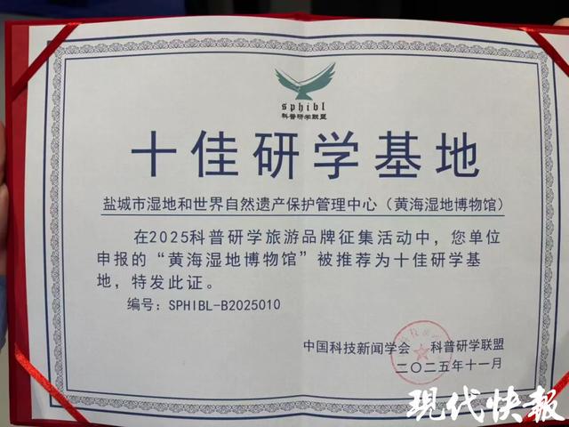 现代快报讯(通讯员 李家梁 记者 王菲)近日,在第七届中国科普研学旅游大会上,黄海湿地博物馆被评选为“十佳研学基地”。这不仅是一纸证书、一个称号,更是对博物馆在自然教育与公众科普领域持续探索的高度认可,也意味着博物馆已逐步成为中国研学旅行领域中一个具有示范意义的参与者。