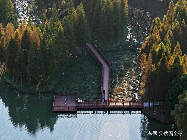 沿着 3 公里环形健身步道前行,脚下是松软的落叶,身旁是层次分明的林木:水杉与池杉挺拔如火炬,深绿、浅红、赭黄的叶片在阳光下熠熠生辉;银杏树枝繁叶茂,金黄的叶片随风飘落,在地面铺就绵延数百米的 “黄金大道”;乌桕树则独具风情,同一枝丫上竟能生出红、黄、绿三色叶片,宛如大自然精心调配的调色盘。