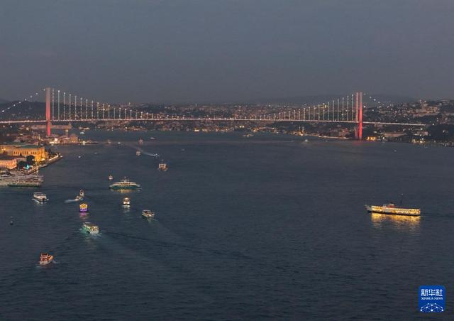 夜幕降临,博斯普鲁斯海峡上船只穿梭,两岸灯火璀璨。