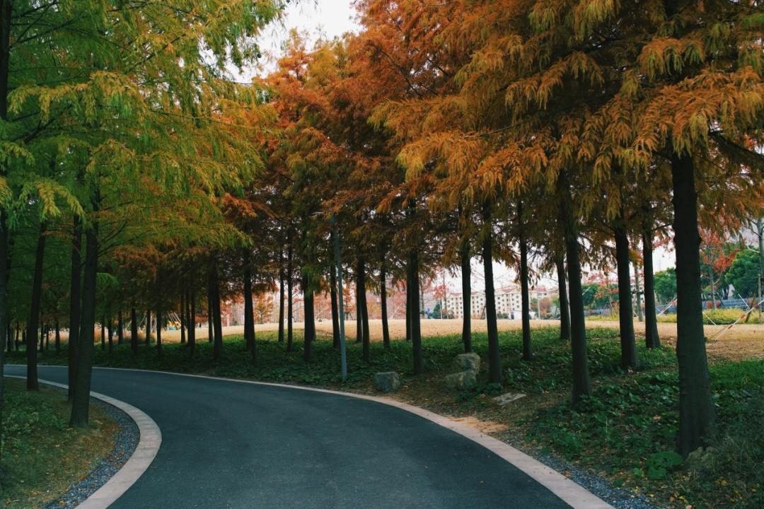 一排排落羽杉像身姿挺拔的卫士,静静伫立。随着季节的深入,落羽杉将逐渐变橘红,再到棕红,最后变成褐色。
