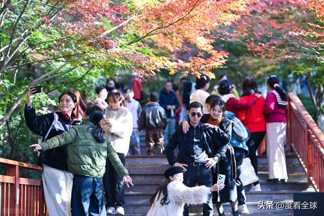 “霜叶红于二月花”的诗意,在深秋的南京栖霞山终于迎来了最热烈的绽放。清晨的薄雾还未散尽,阳光穿透层层叠叠的红叶,在青石板路上洒下斑驳的金红光影,古寺的钟声伴着风叶簌簌声缓缓传开,身着汉服的游人穿行其间,衣袂与红叶交映,恍惚间竟分不清是今人入画,还是画中人走来。连日来,随着气温逐渐走低,这座被誉为“中国四大赏枫胜地”之一的千年名山,15万株色叶树已全面进入最佳观赏期,红枫似火、银杏如金、乌桕斑斓,与古寺、湖泊、栈道相映成趣,构成了一幅震撼人心的秋日画卷,成为全网热议的文旅打卡顶流,每天吸引着数万游客慕名而来,用镜头定格这份独属于江南的秋日浪漫。
