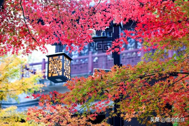 紧随枫香之后登场的,是颜值与意境并存的鸡爪槭。这种树的叶片呈5-7裂的鸡爪状,纤细秀丽,变色节奏相对缓慢,通常在11月上旬开始显现变化,先从叶片边缘泛起橙黄或红色,随后逐渐向叶心过渡。到了11月中下旬的最佳观赏期,一株鸡爪槭上能同时呈现绿、黄、橙、红等多种渐变色彩,枝条下垂如丝,微风拂过,叶片轻摇,像无数灵动的彩蝶翩翩起舞。栖霞山“最美50米”景观带,就是以鸡爪槭为主角打造的,从栖霞禅寺牌坊到哼哈殿的这段路程,两侧的鸡爪槭枝叶交织,形成一条红橙相间的隧道,阳光穿过叶片,在地面投下跳跃的光斑,走在其中,仿佛置身于梦幻的童话世界。