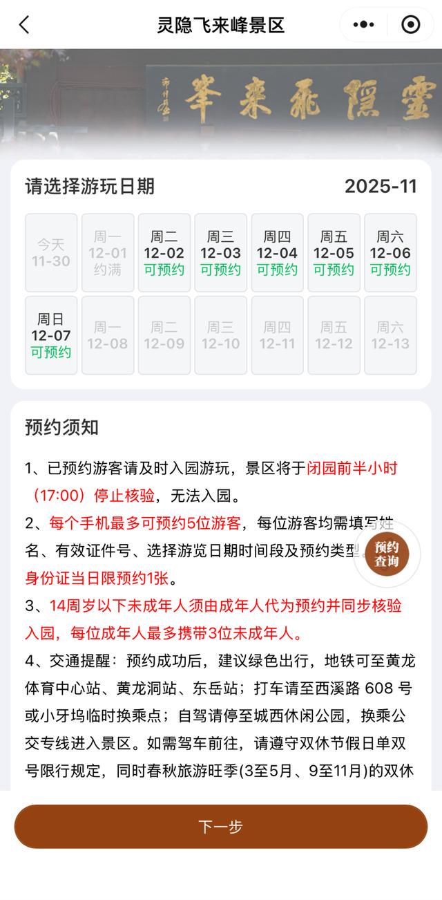 今早8点36分,潮新闻记者在微信平台上搜索“杭州灵隐飞来峰”小程序,进入预约通道,发现12月1日的预约名额已满,但目前仍可以预约12月2日—12月7日的入园名额。