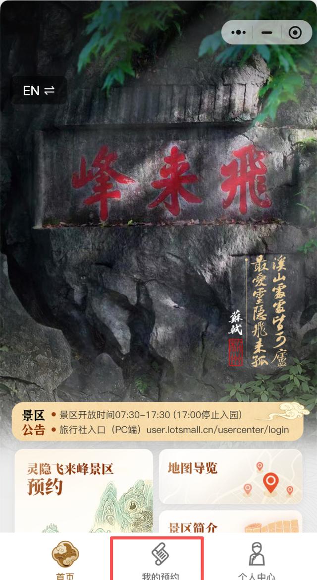 当您到达景区入口处,第一步先提前打开“杭州灵隐飞来峰”小程序,在“我的预约”中,点开实时预约凭证(现场登记和免预约游客同步出示凭证)。