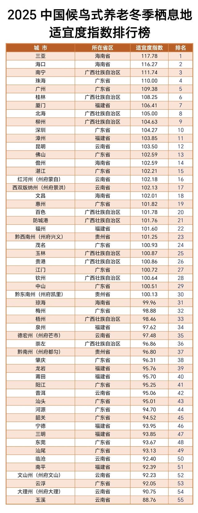 本周,中国将迎大雪节气,你家岁末年初的度假计划有没有考虑“雁南飞”?12月1日,《2025中国候鸟式养老冬季栖息地适宜度指数》在上海交通大学发布,为日渐盛行的候鸟式养老提供具有科学依据的栖息地选择手册。十大城市中,全境处于热带的海南省城市数量仅列第三,而广西壮族自治区可谓“赢麻了”。