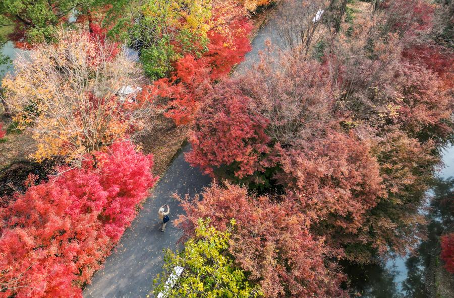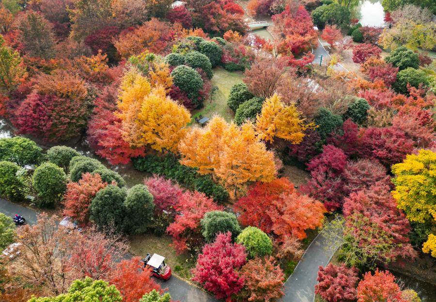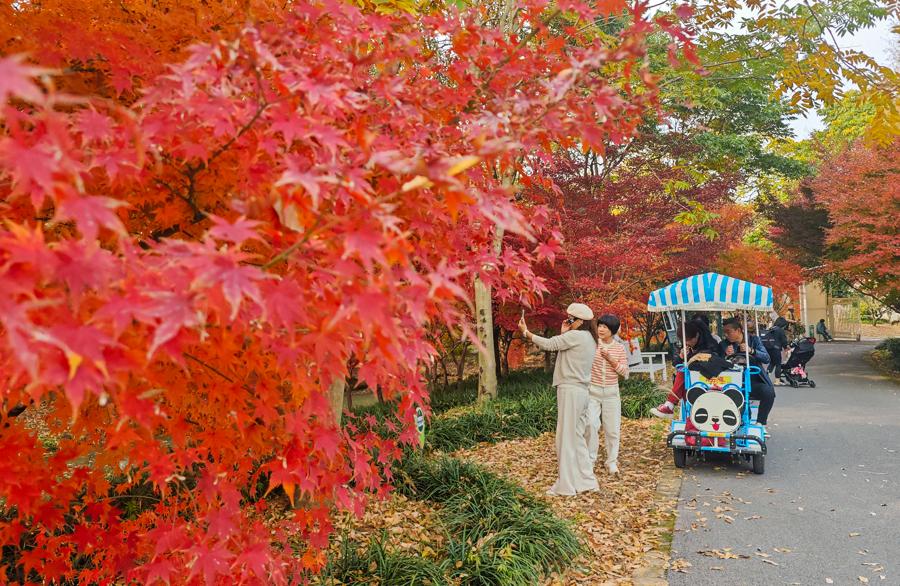 园内秋景园与花海区域,鸡爪槭、美国红枫、挪威槭等枫树沿步道铺展,红、黄、绿三色叶片交织成斑斓画卷,构成多重诗意景致。吸引不少市民游客穿梭林间,用镜头定格深秋浪漫。