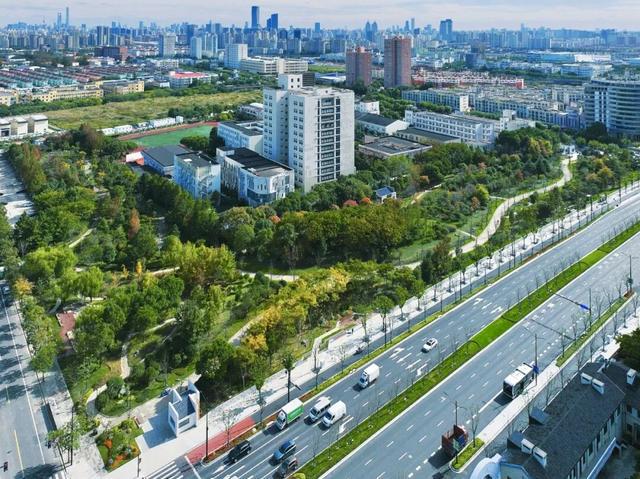 不只是联通普陀、宝山与长宁的交通干道,也是一条流动的风景线。路旁树木整齐排列,枝叶仍缀满鲜活绿意,零星橙黄点缀其间,未见萧索、更显生机。偶尔一阵风过,几片彩叶翩跹而落,为繁忙的城市节奏添上一笔温柔注脚,让通勤之路也浸润着自然的清新。