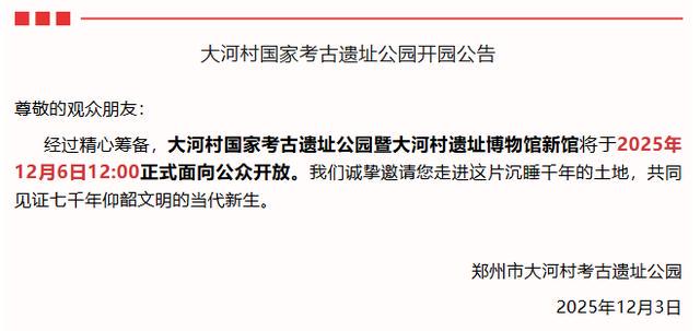 12月3日,记者从大河村国家考古遗址公园获悉,博物馆新馆将于2025年12月6日12:00正式面向公众开放。